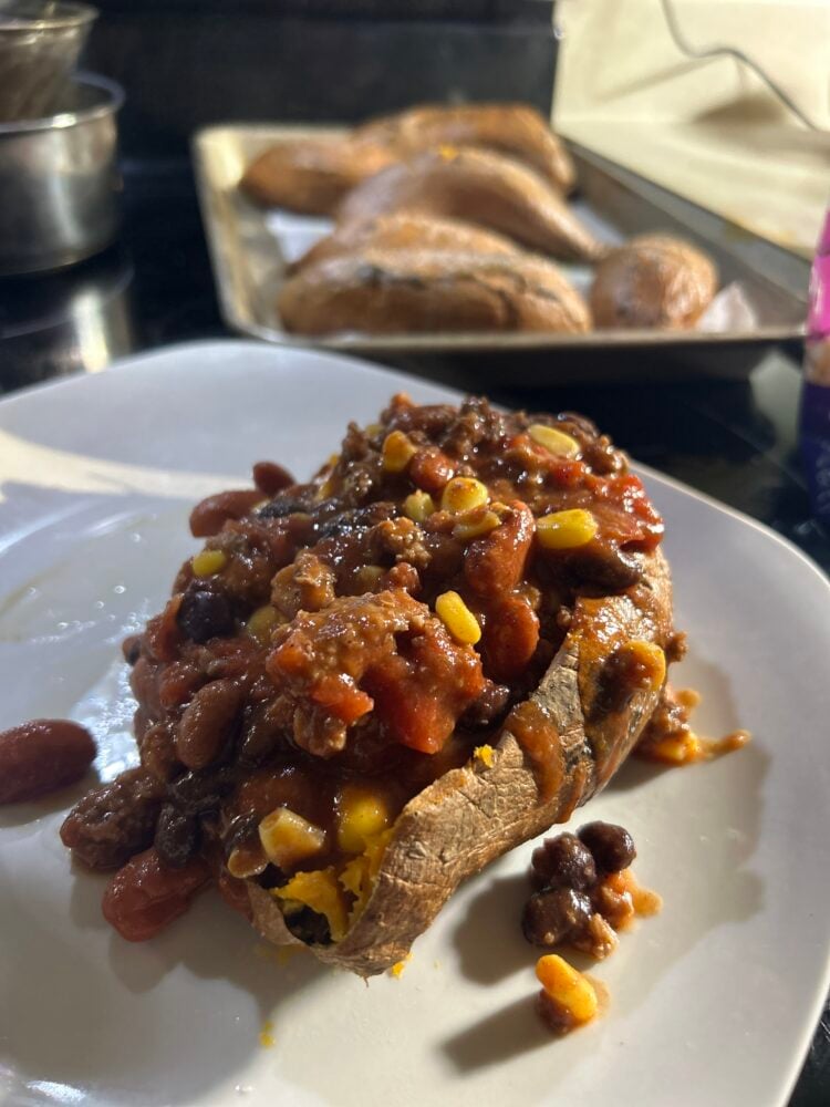 This is one of my favorite dinners! It tastes great and it’s nutritious. Bake a sweet potato, open it up, and fill it with butter & black beans or chili. Delish!