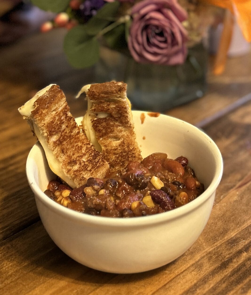 Chili is a go-to dish in my house. I make it a little differently, but it’s just the way my kids like it. Toss 1 can each of dark kidney beans, light kidney beans, black beans, corn, and diced tomatoes into a pot. You can just use one type of bean (multiple cans) if you prefer. Add 1 cup beef broth (or warm water with boullion cube). Bring to a boil and simmer to thicken. Add more broth as needed.