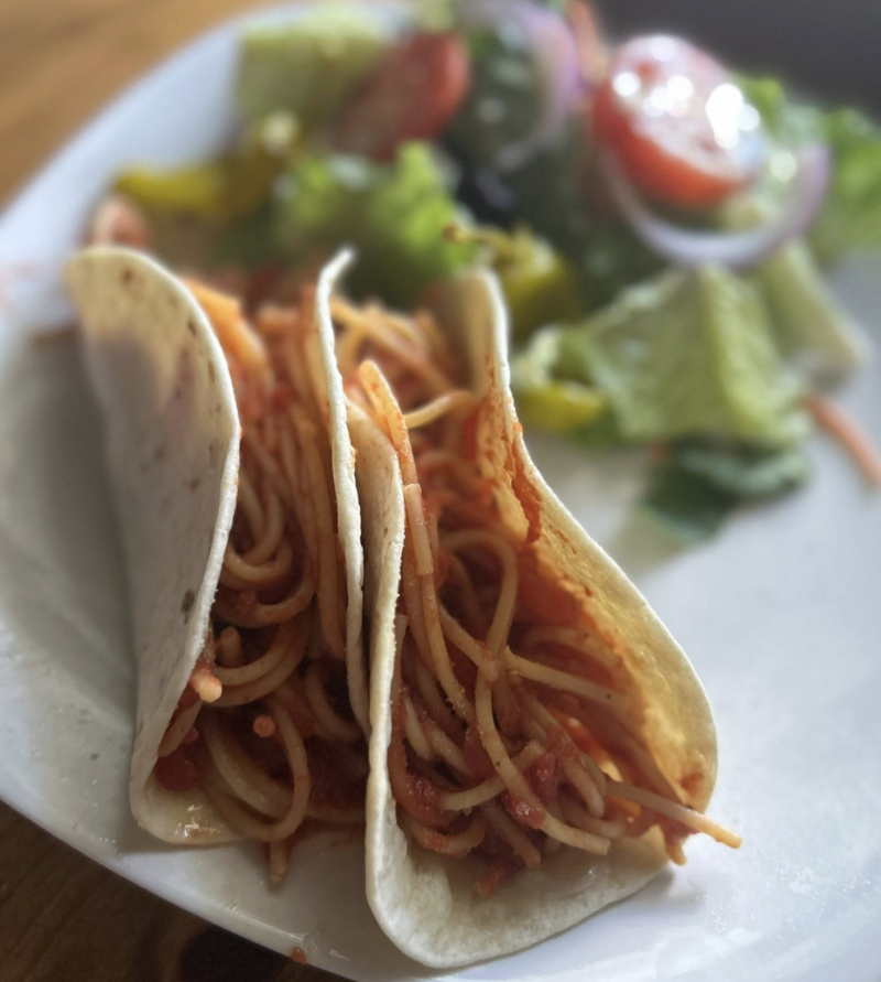 Instead of buying a store-bought sauce, I use one can of diced tomatoes, one can tomato paste, and one can tomato sauce. You can skip the tomato sauce and use water thin the paste if you need to. My kids love when I make spaghetti tacos (inspired by i-Carly). This makes the noodles stretch even further without costing much more- especially if you make your own tortillas.