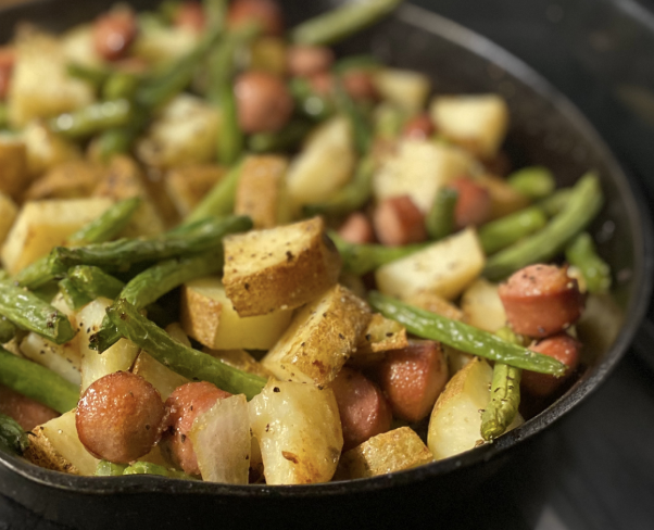 This was my FAVORITE meal as a kid. My mama called it goulash because she didn’t know what else to name it. Potato chunks, hot dog or sausage slices, and green beans cooked in a skillet– that’s all you need to make this delicious meal!