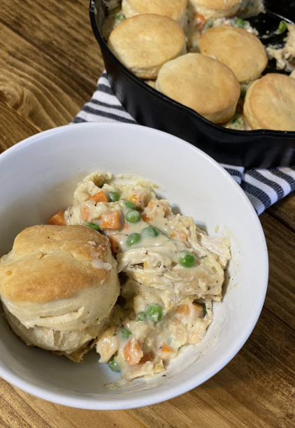 Chicken pot pie seems complicated and expensive, but it is really the opposite. By using homemade cream of chicken soup, homemade biscuits, and canned or frozen veggies, this meal costs next to nothing.