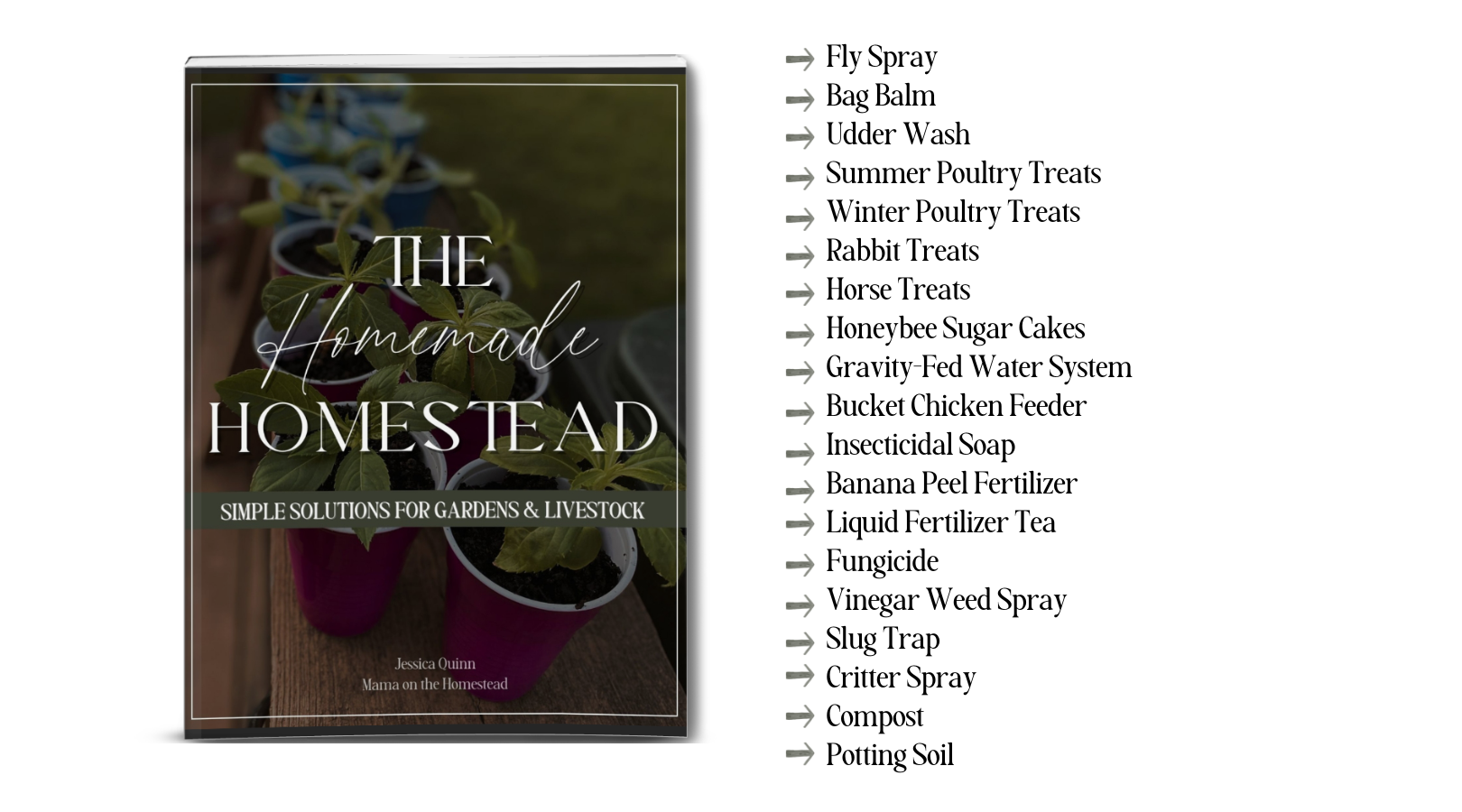 This e-book includes 16 homemade homestead recipes like DIY garden products, supplies to use with your livestock (like fly spray), AND livestock treats.